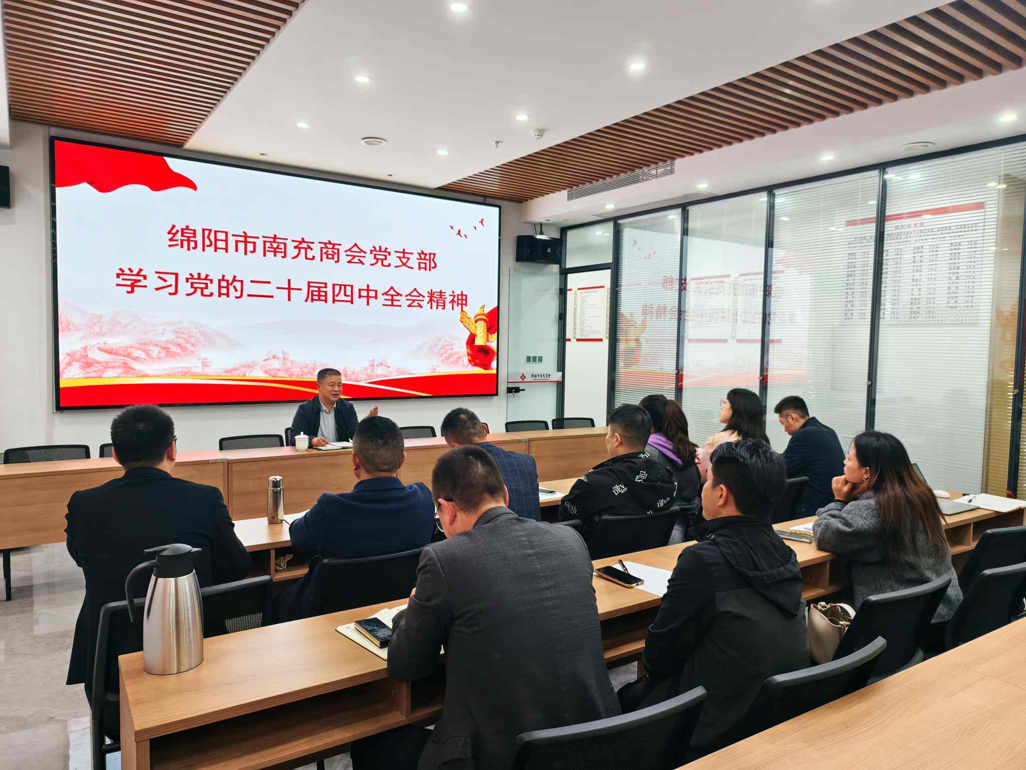 10月30日下午,绵阳市南充商会党支部在商会会议室召开专题党员大会,聚焦党的二十届四中全会精神开展深入学习。支部书记王维国、组织委员张发明、宣传委员蒲若兰,以及支部党员、发展对象、入党积极分子等11人参会,沉浸式领悟全会精神实质。会议由支部书记王维国主持。