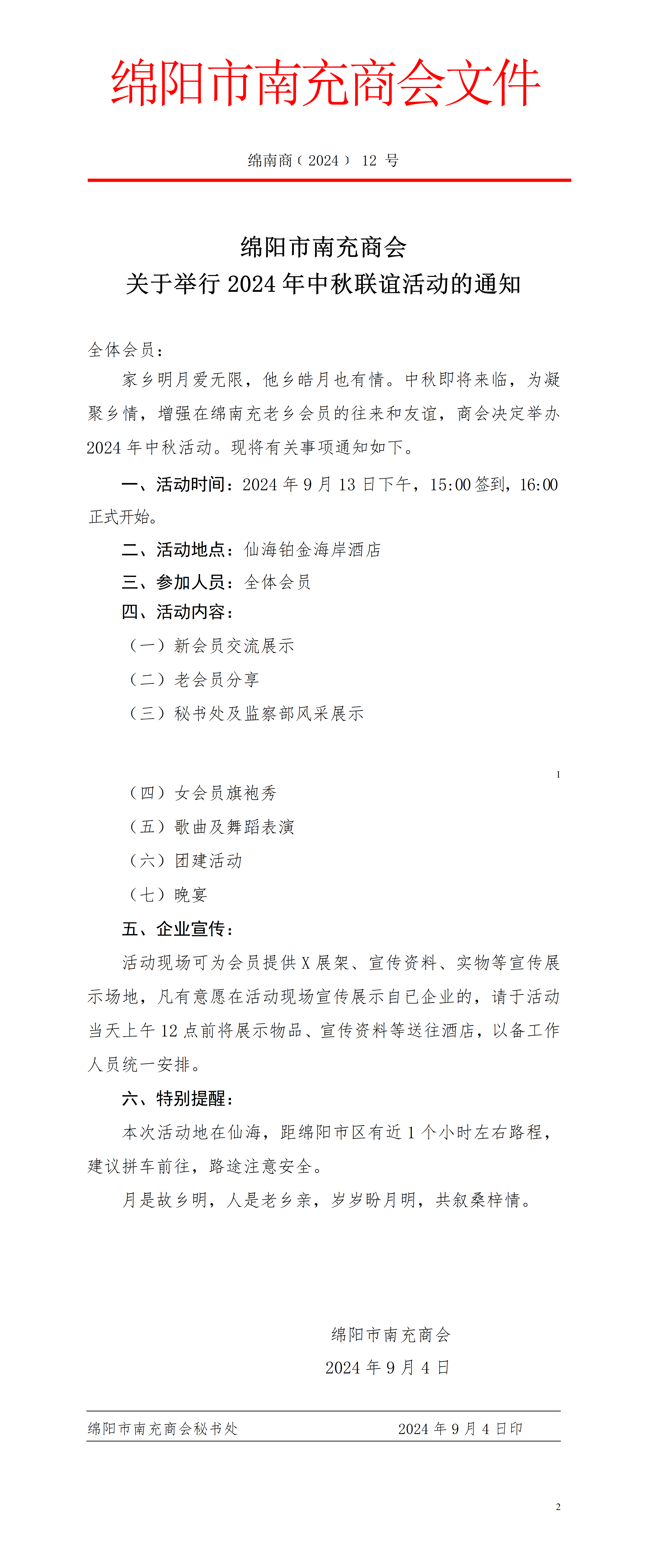 关于举行2024年中秋活动的通知