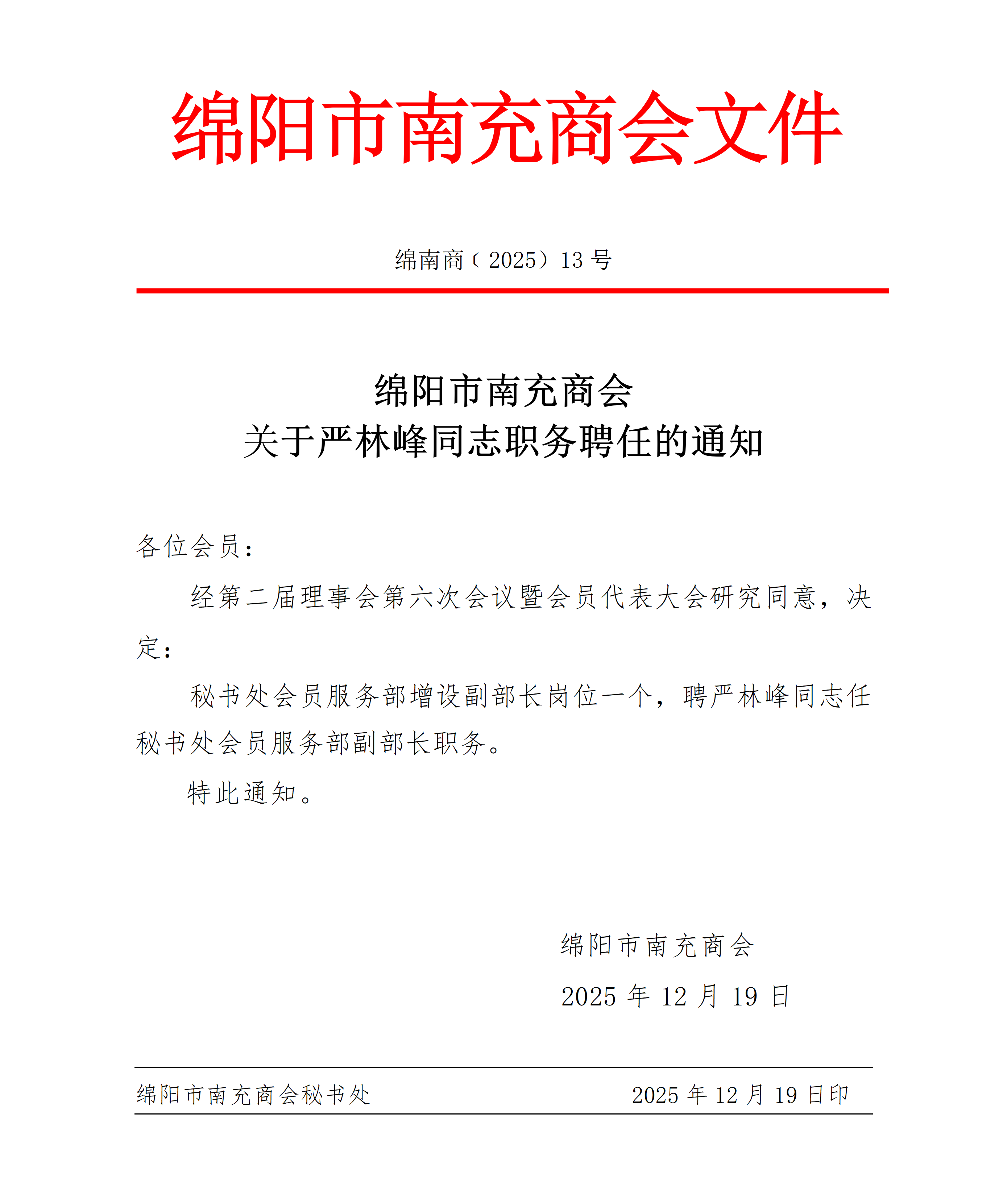 关于严林峰同志职务聘任的通知